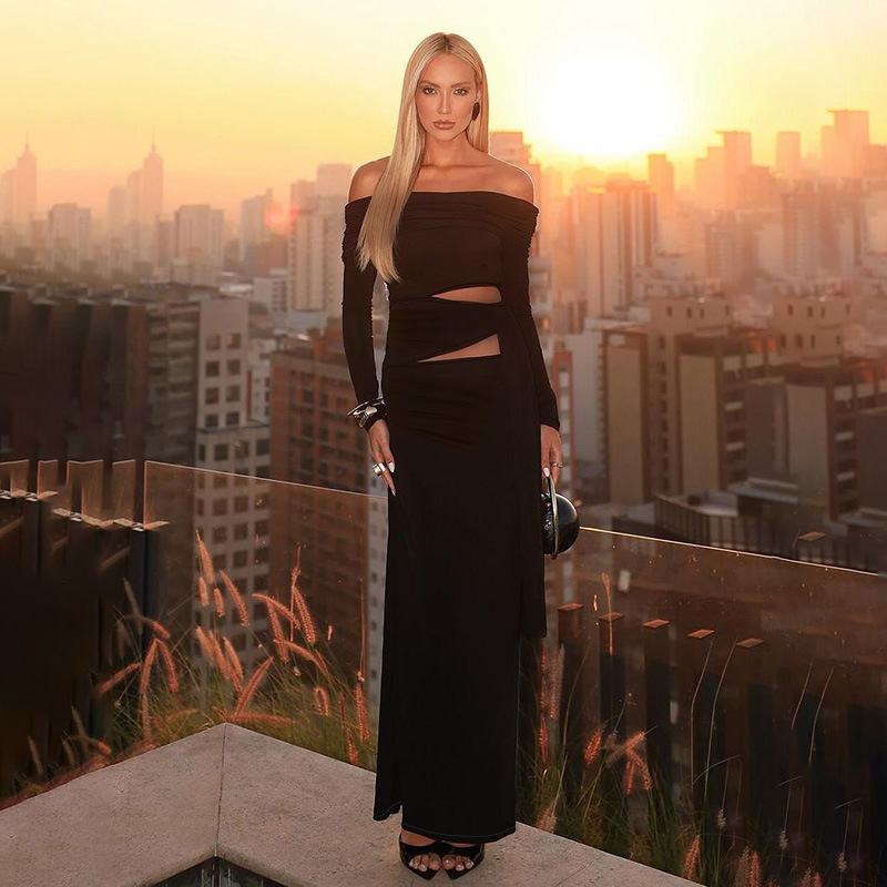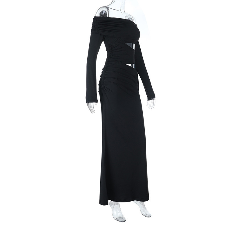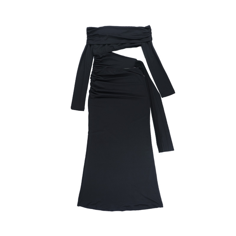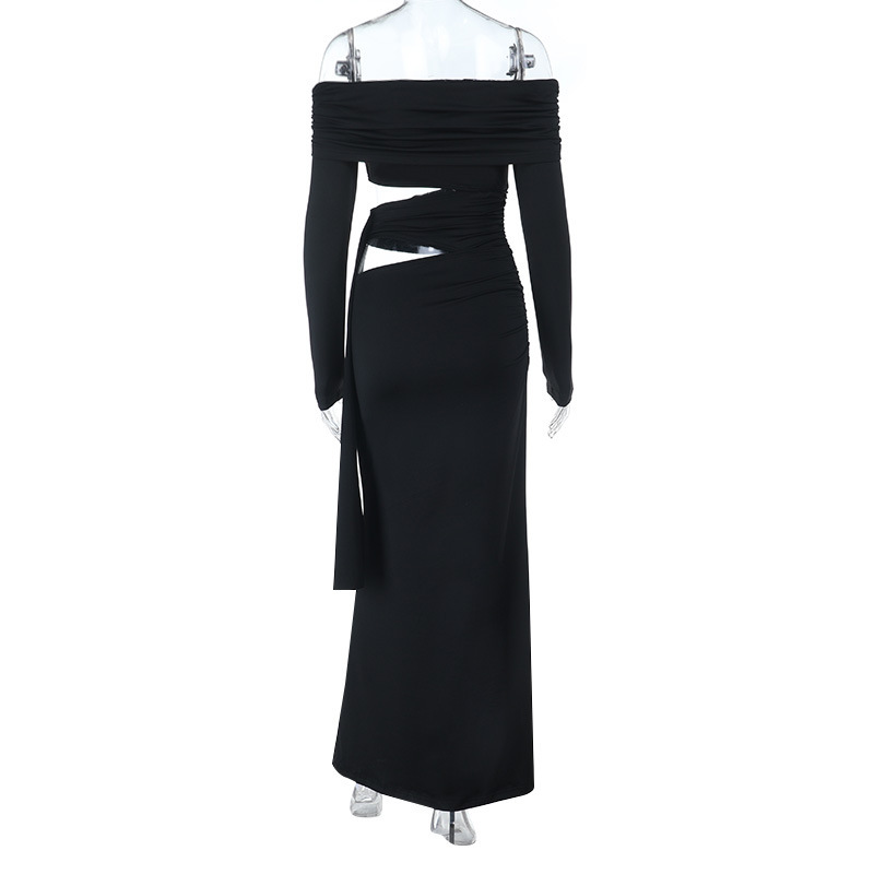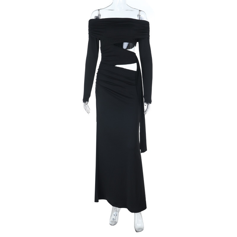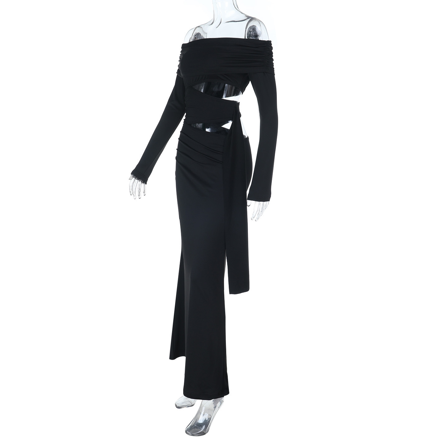 Sexy strapless hollow mesh patchwork long sleeved dress