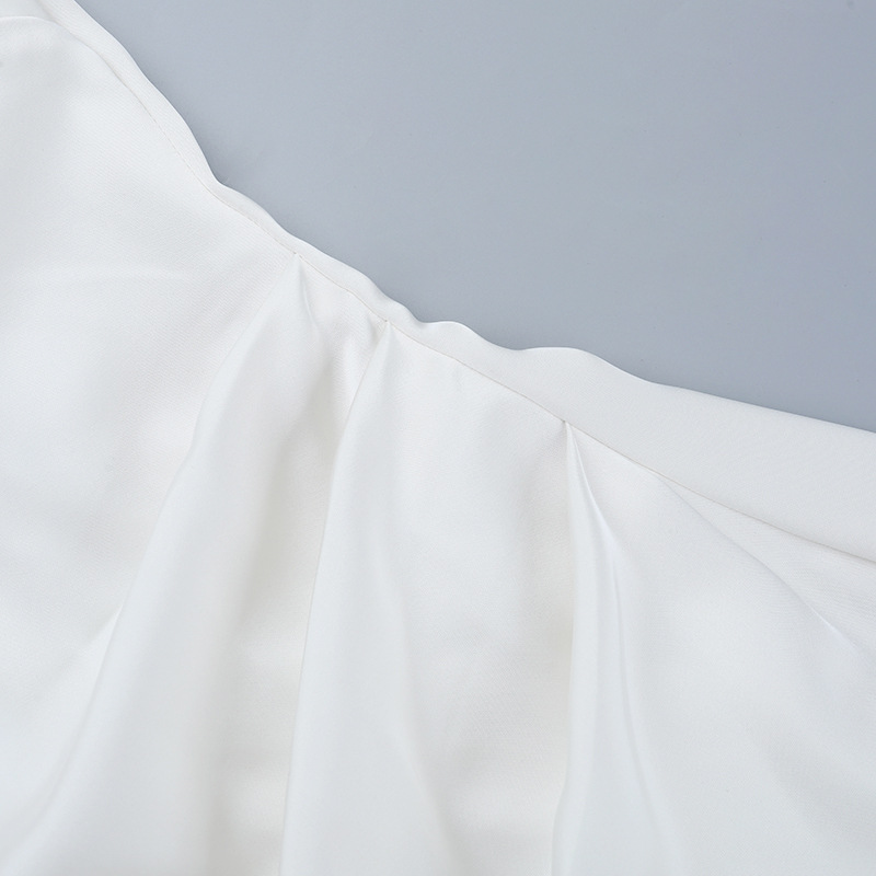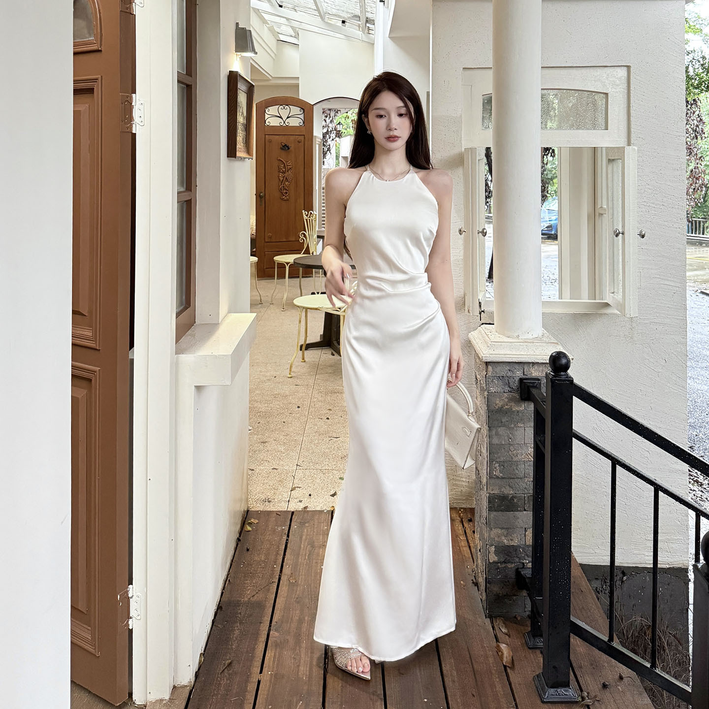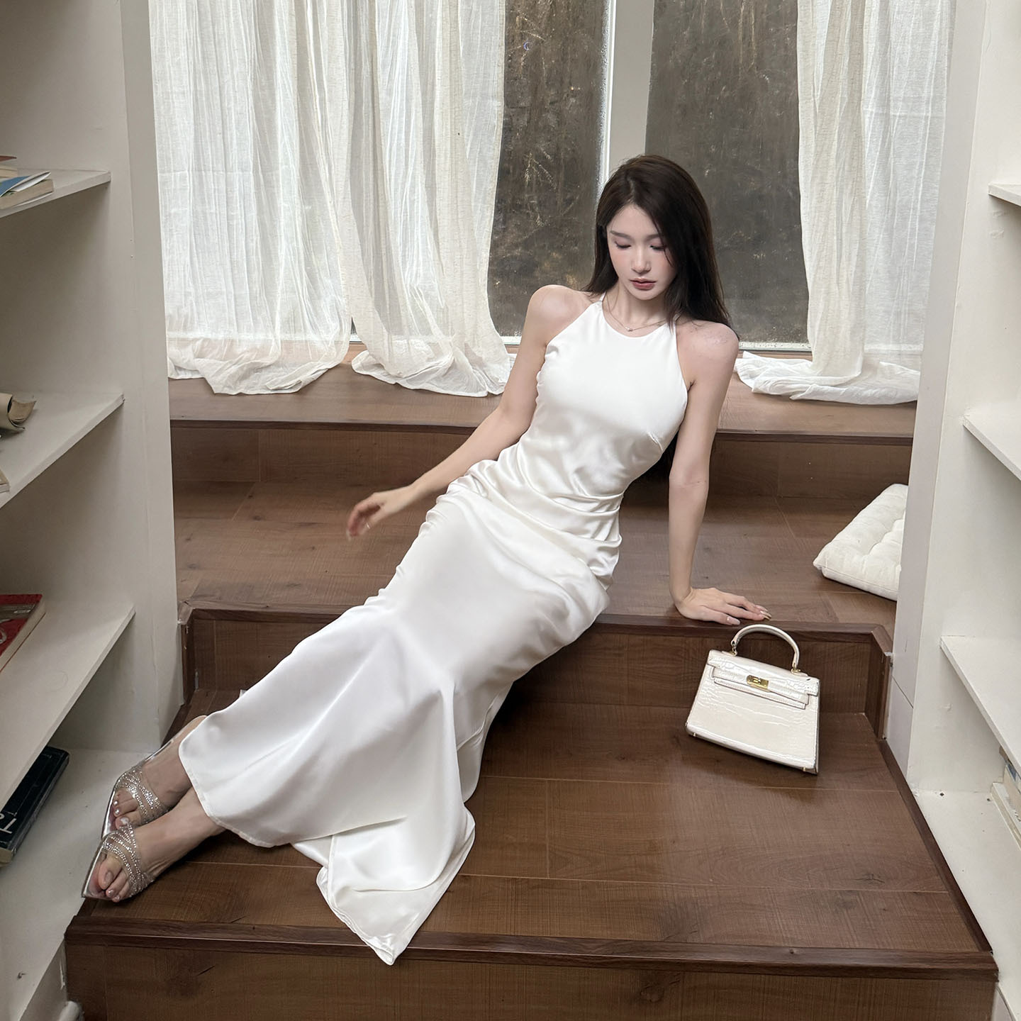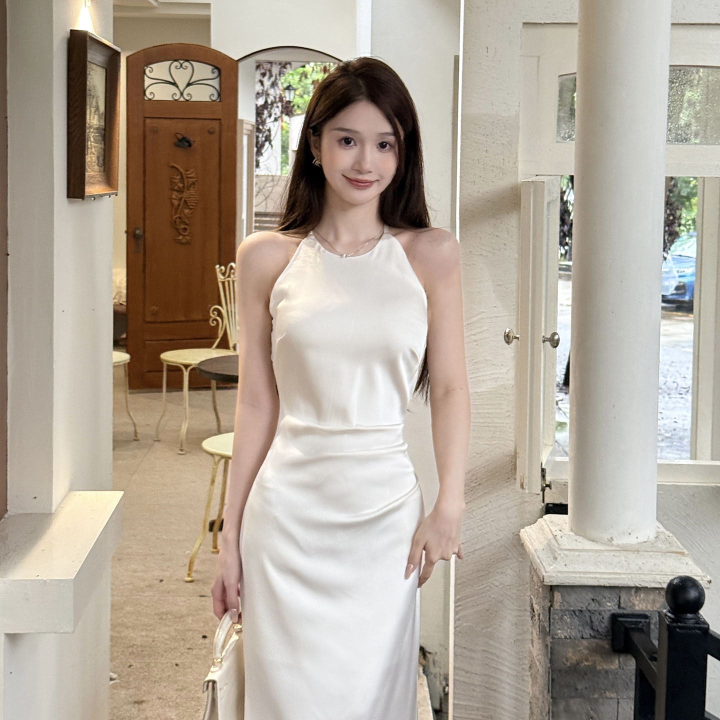 Sleeveless ruffled satin French-style dress with a high-end aesthetic