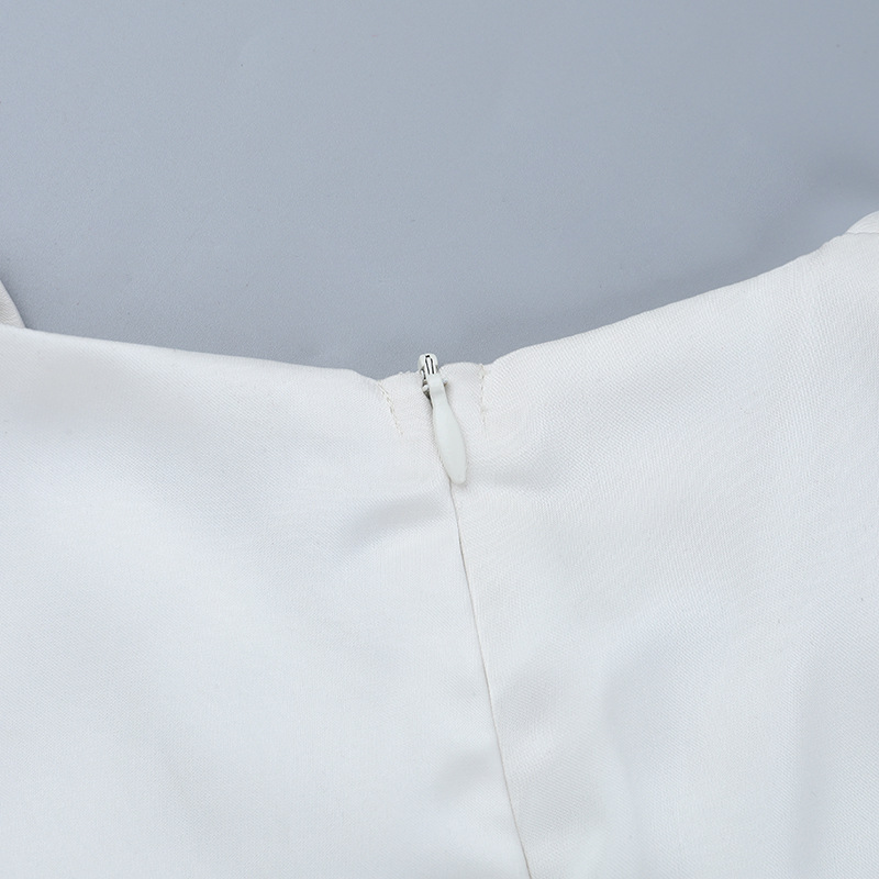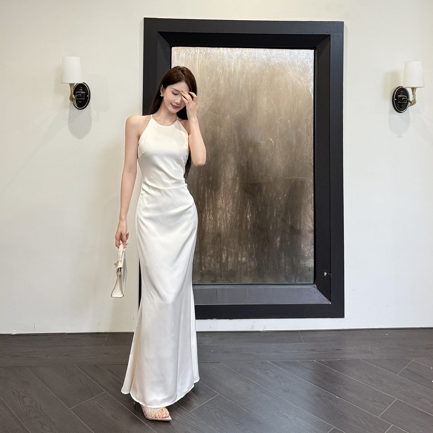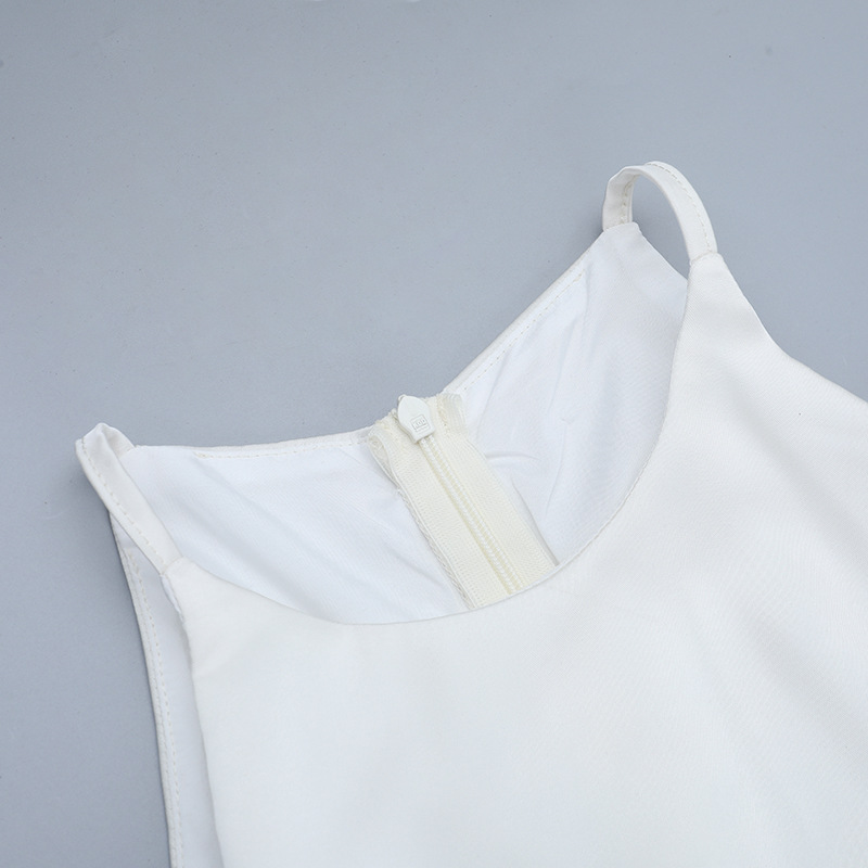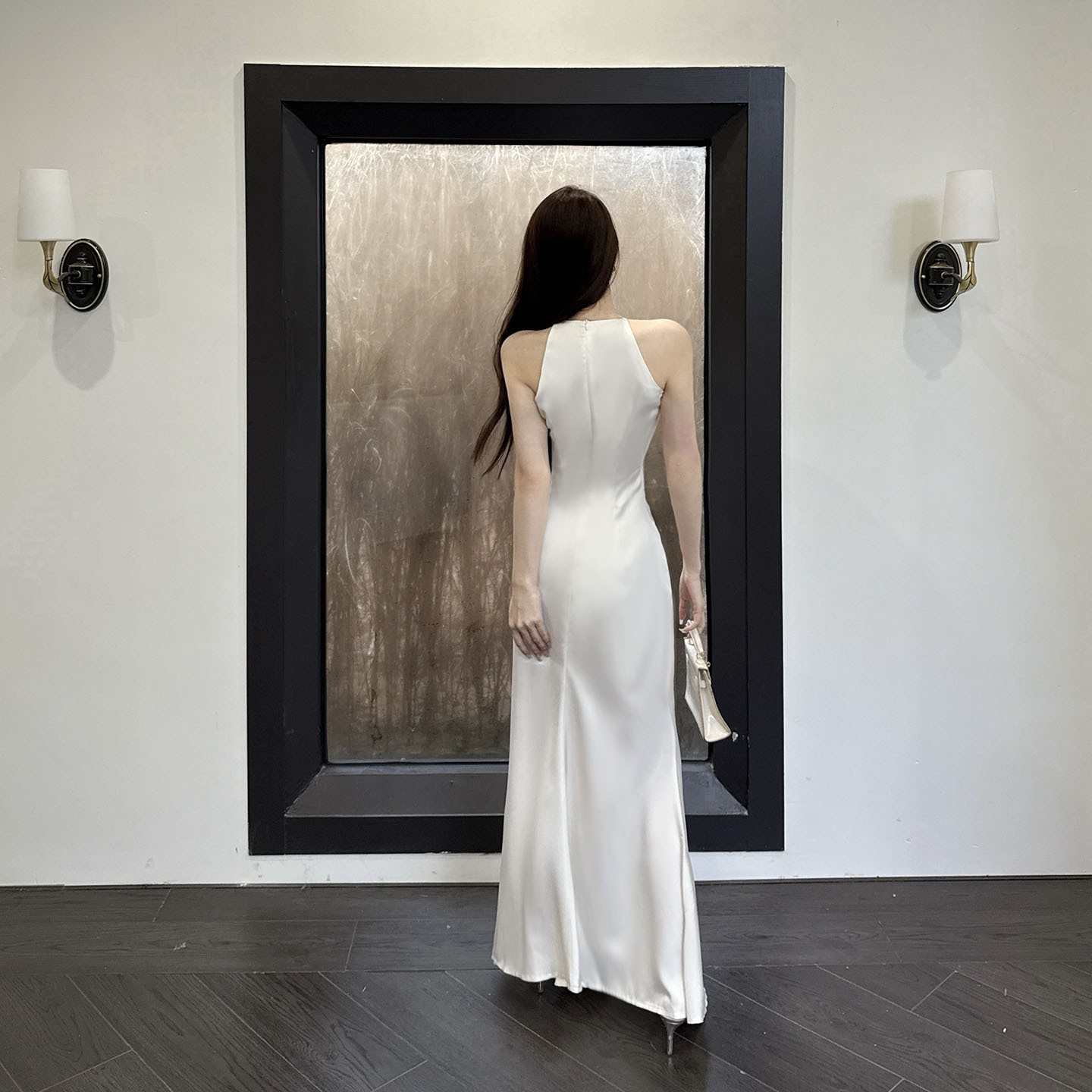 Sleeveless ruffled satin French-style dress with a high-end aesthetic